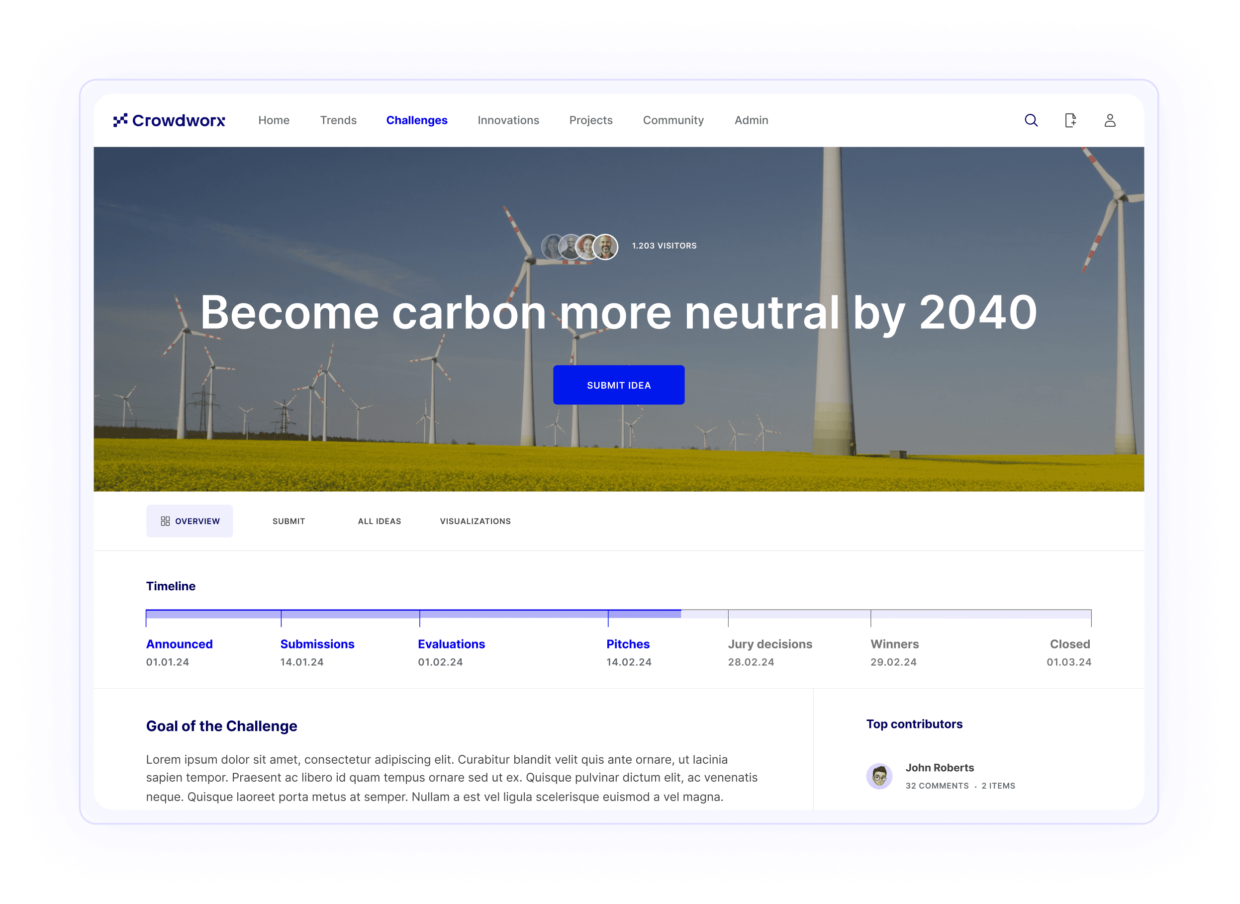 Die Durchführung von Ideen-Challenges mit diversen Abteilungen, Standorten oder sogar mit Kunden und externen Partnern kann komplex sein. Crowdworx vereinfacht den gesamten Prozess, sodass Sie jederzeit wirkungsvolle Ideen-Challenges starten können.