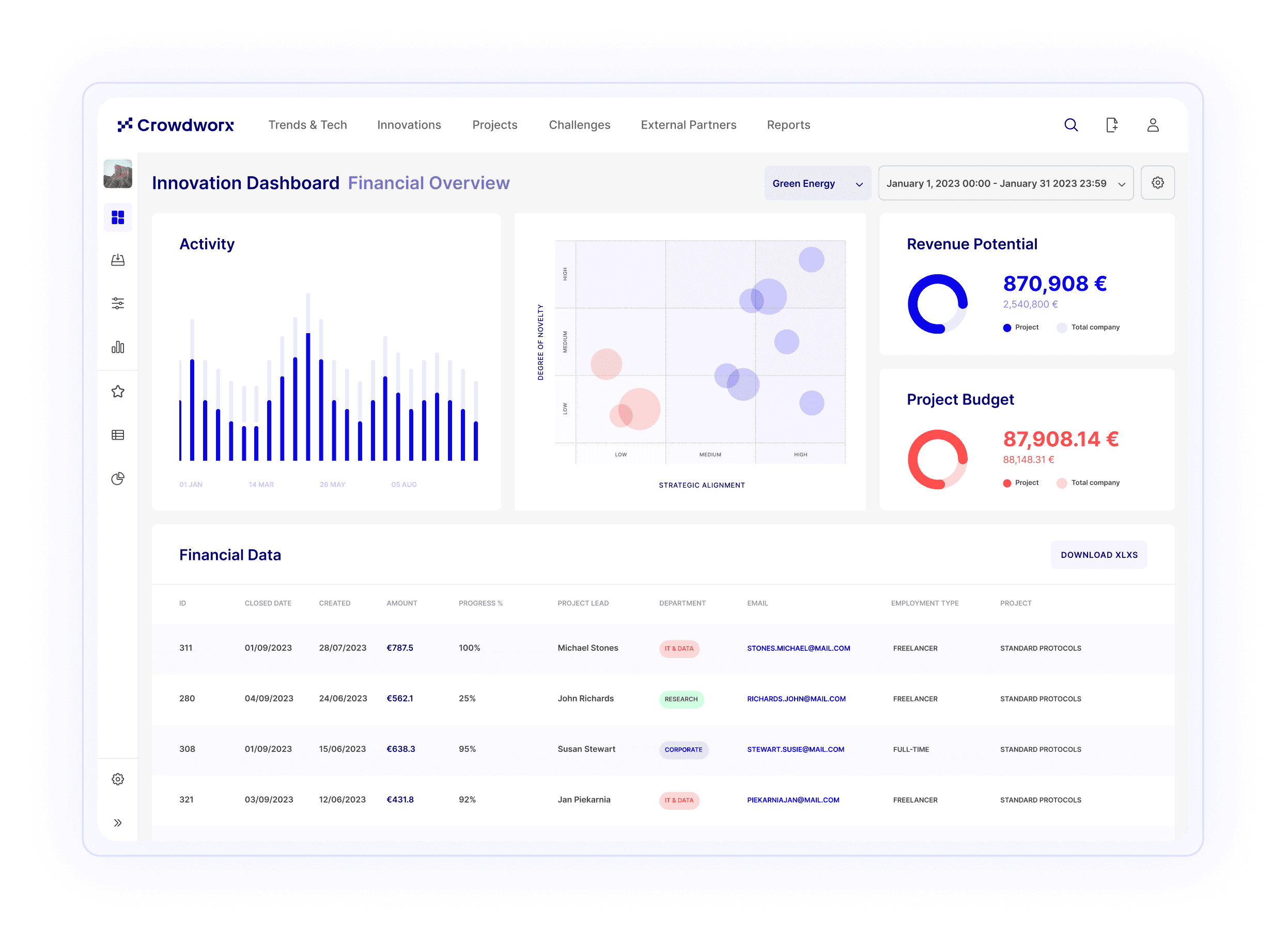 Ohne eine Single-Source-of-Truth lassen sich Projekte nur schwer vergleichen, Risiken bleiben unbemerkt und Innovationen mit hohem Potential zu spät erkannt. Crowdworx sorgt für Struktur und Transparenz im gesamten Portfolio und gewährleistet so schnellere, bessere datengestützte Entscheidungen.