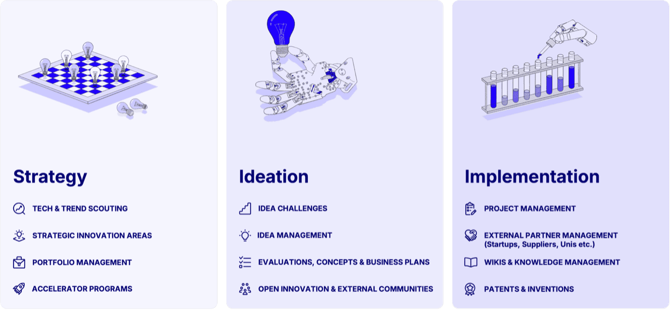 Software für das Innovationsmanagement deckt den gesamten Lebenszyklus von Innovationen ab – von der Strategie und der Ressourcenzuweisung bis hin zur Ausführung und Markteinführung – und umfasst in der Regel Funktionen für:
