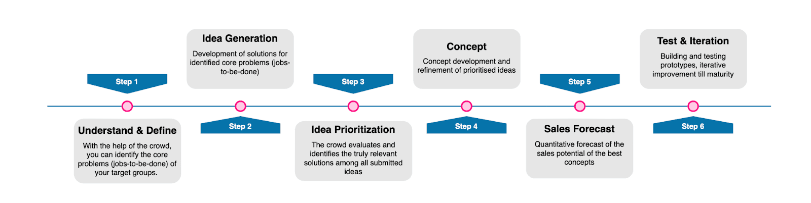 Engage external stakeholders: Involve customers, suppliers, and partners in co-creating innovative solutions. Seek their input and feedback throughout the process to align solutions with market needs. Use digital collaboration tools to facilitate communication and idea sharing. Through the Crowdworx platform, you can invite startups, universities, suppliers, or citizen innovators to contribute.