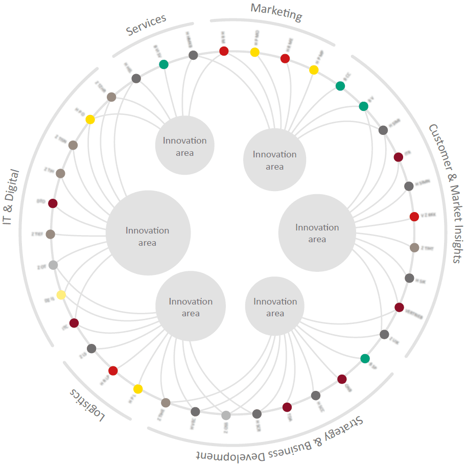 Figure 2: The proposed Innovation Network for REWE’s innovation activities aligning departments along shared goals and innovation areas & projects . Source: Crowdworx.